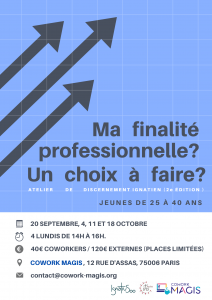 Le Cowork Magis propose pour la deuxième fois un atelier de discernement professionnel, à partir des outils de la spiritualité ignatienne. Cet atelier est animé par Maria Becquey, directrice du Cowork Magis, et Alvaro Lobo sj, accompagnateur jésuite du Cowork.