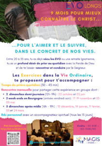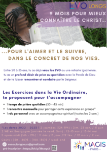 Les Exercices dans la Vie Ordinaires (EVO) sont un temps de rencontre avec le Christ au cœur de ton quotidien sous forme d’une retraite spirituelle ignatienne dans la vie. Quatre semaines d’exercices spirituels pour se laisser rejoindre par le Christ dans notre vie ordinaire, rythmées par des temps de prière personnelle, de relecture, d’un accompagnement spirituel et de temps de partage.