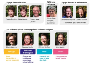 Les piliers « Prier », « Se Former et Témoigner », « Servir » et « Partager » s’appellent l’un l’autre et ne peuvent être séparés. Ils nous portent à la joie, l’audace et l’espérance.