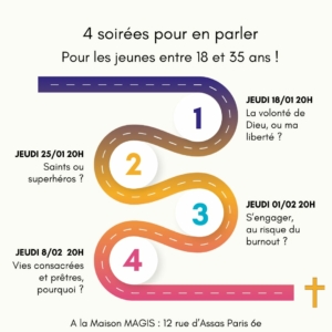Deux fois par an, la Maison Magis propose aux 18-35 ans de vivre un temps de rencontre avec le Christ au cœur du quotidien sous forme d’une retraite spirituelle ignatienne dans la vie. Quatre semaines d’exercices spirituels pour se laisser rejoindre par le Christ dans notre vie ordinaire, rythmées par des temps de prière personnelle, de relecture, d’un accompagnement spirituel et de temps de partage.