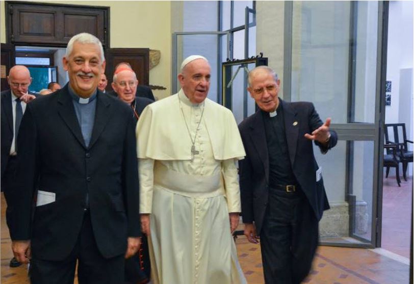 Le P. Arturo Sosa, actuel supérieur général de la Compagnie de Jésus, en compagnie du pape François, lui-même jésuite.