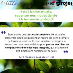 - Samedi 23 mai : Face à la crise actuelle, repenser nos modes de vie à la lumière de Laudato Si’