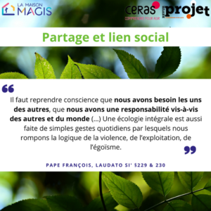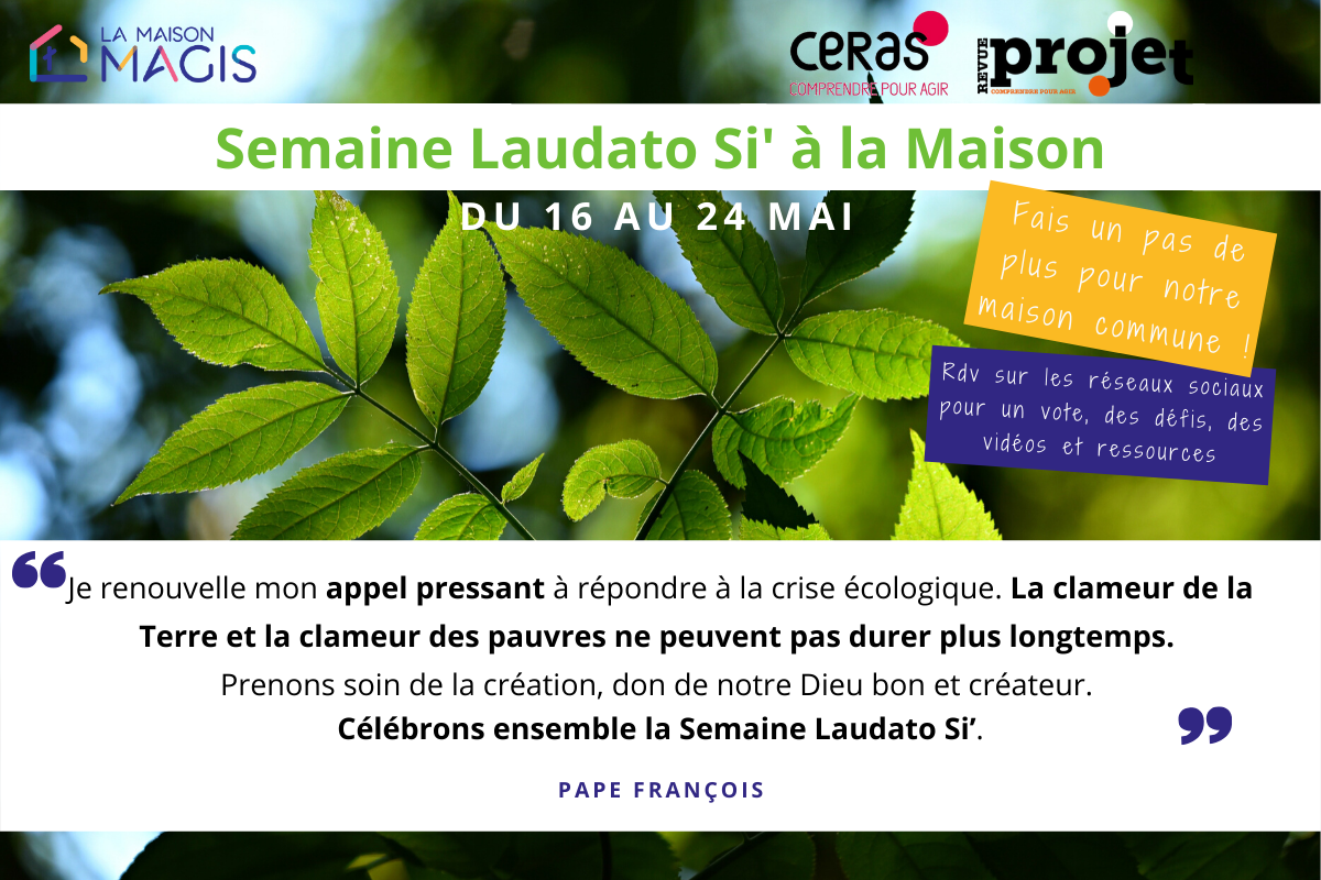A cette occasion, la Maison Magis propose une semaine en ligne, à suivre cette page et sur Facebook. Cette semaine s’adresse aux « habitants » de la Maison, des activités Magis, du Cowork, de JRS France, d’Inigo, ainsi qu’à toutes les personnes qui désirent être davantage solidaires de la Terre et des pauvres.