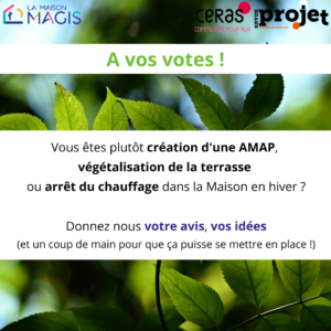- Samedi 16 mai : L’écologie, la Maison Magis et vous ! – Lancement d’un vote sur des idées pour une Maison Magis plus écolo