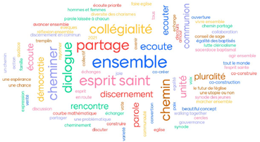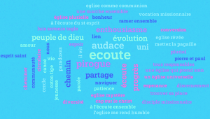 Les témoignages de Julian et Céleste ayant tous deux participé au Synode des Jeunes ont enrichi le propos en soulignant notre responsabilité à tous. Au commencement de la soirée, avant les différentes interventions, les participants ont exprimé ce que représentait la Synodalité pour eux sous forme d’un nuage de mots.